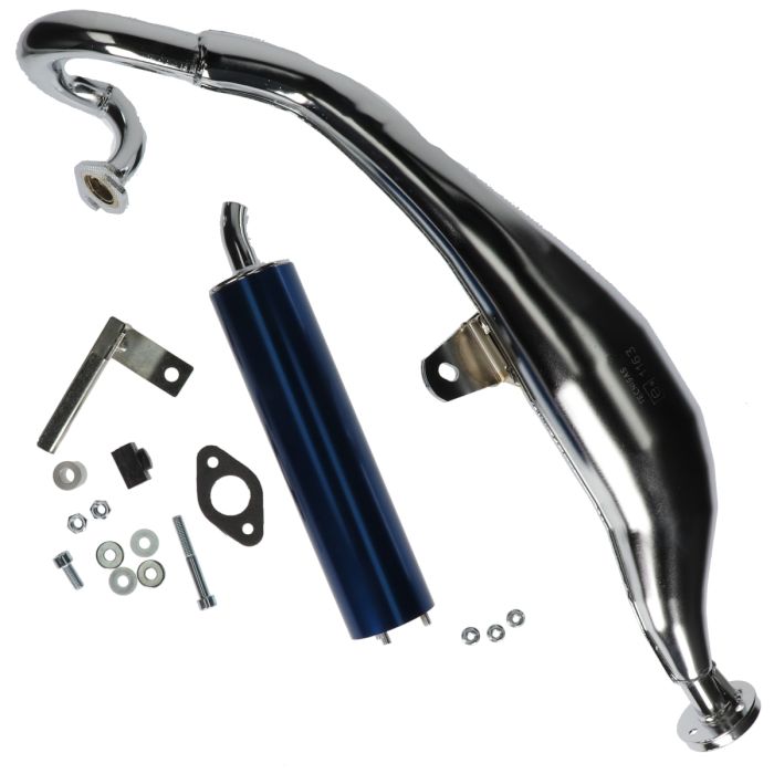 De belangrijkste functie van de uitlaat is het dempen van het geluid. Het is daarom zeer belangrijk deze te vervangen bij een lekkage. Als je wilt dat je scooter meer power / vermogen krijgt adviseren we een sportuitlaat te monteren. Je scooter zal bij een goede afstelling van de koppeling en carburateur betere prestaties leveren dan een standaard uitlaat! Deze uitlaat van het merk Tecnigas is goedgekeurd en van uitstekende kwaliteit!
