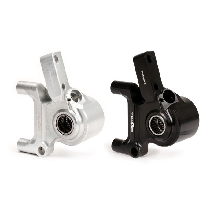 Der BGM PRO Bremssatteladapter besteht aus hochfestem Aluminium welches in einem spezialisierten Betrieb in Italien CNC bearbeitet und final hart eloxiert wird. Damit widersteht es auch härtesten Umwelteinflüssen und bleibt dauerhaft solide und optisch ansprechend. Die Aufnahme wird einbaufertig, mit bereits montierten High-Quality Nadellagern von europäischen Lieferanten (SKF/INA) bestückt, geliefert.