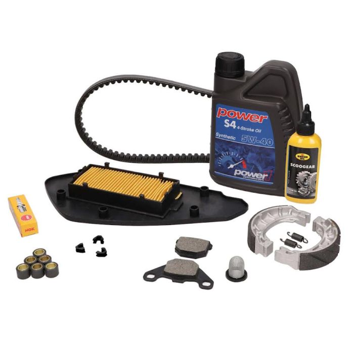 • Ngk-Zündkerze • Endurance-Luftfilterelement • Rollen des Ausdauervariators • Leitfäden für Ausdauervariatoren • Endurance-Keilriemen • 5W40 BO Vollsynthetisches Öl (speziell für den Roller entwickelt) • Kroon Getriebeöl • Endurance-Kraftstofffilter • Endurance-Bremsschuhe hinten • Endurance-Bremsbeläge • ÖlfilterWartungsset für die Ausdauer